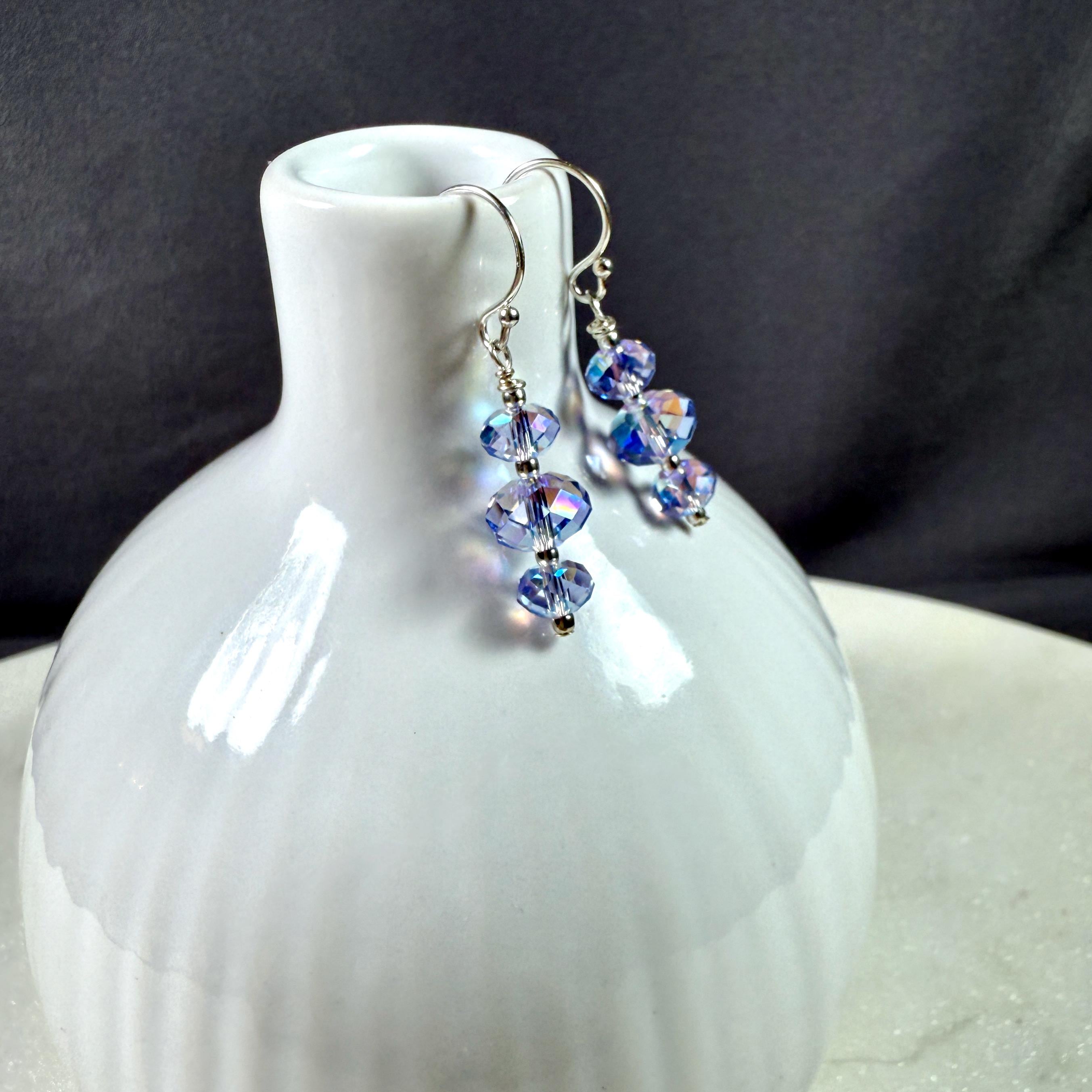 Inspired by the shimmering reflection of moonlight on water, this handmade set features iridescent lavender / periwinkle crystals paired with unique, fluid silver wave bars for a look that is both organic and elegant!
