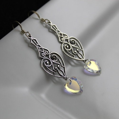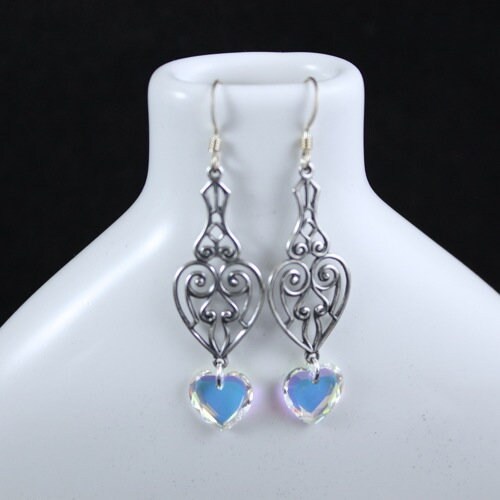 Earring Ingredients: Antique Victorian style sterling silver scroll-like tear drop shaped component with a Swarovski Crystal Aurora Borealis (AB) flat heart shaped bead suspended from the bottom.